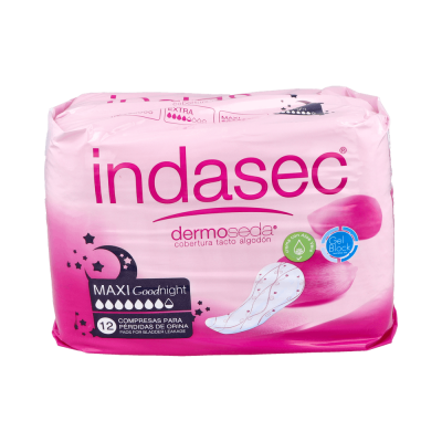 Indasec Maxi Good Night es la solución perfecta para controlar las pérdidas abundantes y habituales nocturnas. Ofrece seguridad durante toda la noche garantizando así el descanso pleno. Las principales características de Indasec Maxi Good Night son: Dermoprotect, mayor protección para tu piel con grosella negra, aloe vera y extracto de ambiaty. Controlsec, máxima eficacia para neutralizar el olor. Dermoseda, cobertura tacto de algodón que garantiza una mayor suavidad. Forma anatómica de la compresa, más confortable y discreta *Para pérdidas de hasta 350ml. ¡Protegida toda la noche con Indasec Maxi Good Night!
