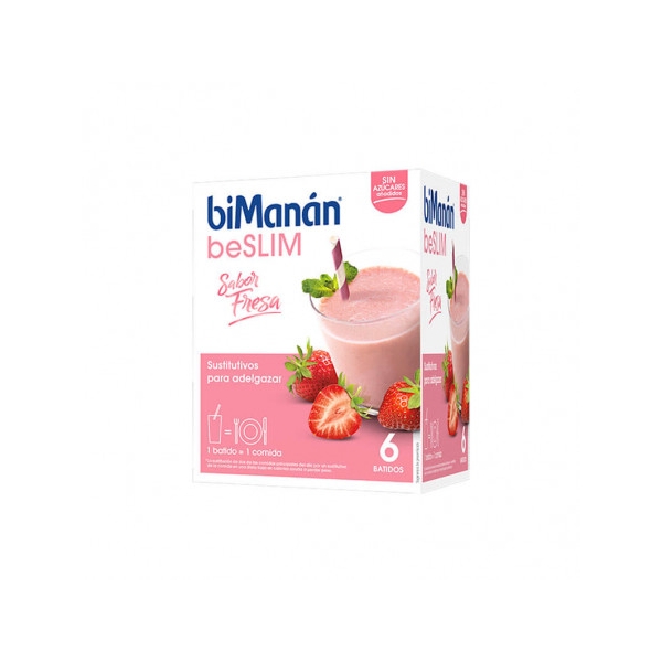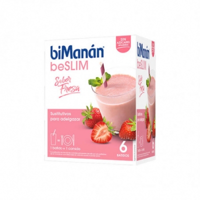 Bimanan Beslim batido sabor fresa, 6 sobres, ayuda a adelgazar. Contiene vitaminas, minerales, proteínas y grasas. Contribuye a proteger la masa muscular y mantener su firmeza durante el período de adelgazamiento, ya que solo aporta 216 calorías por comida. Desarrollado para sustituir una o dos de las comidas principales.