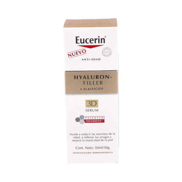 Eucerin Hyaluron-Filler + Elasticity Sérum 30ml es un sérum facial antiedad ligero e hidratante. Ayuda a reducir las manchas (hiperpigmentación) asociadas a la edad, rellena las arrugas profundas y favorece un aumento de la elasticidad y firmeza de la piel.