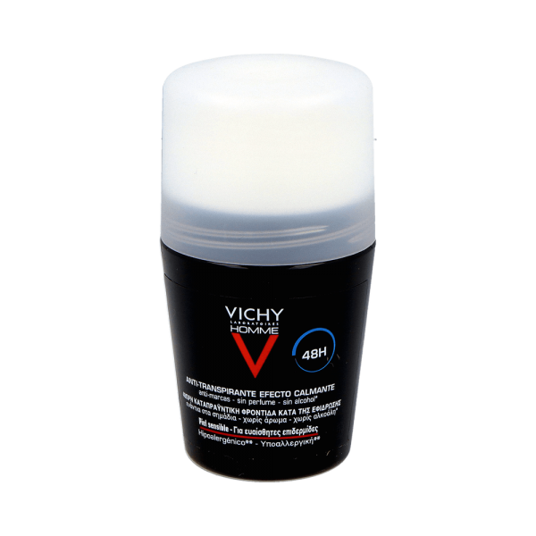 Para todos aquellos hombres que tengan la piel sensible, Vichy Homme desodorante piel sensible roll on te ofrece una cobertura y eficacia integral a la hora de combatir los síntomas de la transpiración. Este desodorante Vichy te garantiza 48 hrs. de frescura gracias a una composición rica en activos anti-transpirantes y oligo-zinc que calman y regulan la transpiración sin causar irritaciones ni escozores. Una fórmula hipoalergénica que se adapta a la perfección con aquellas pieles sensibles ya que no contiene perfume, parabenos ni alcohol. No mancha la piel ni la ropa. ¡Consigue máxima eficacia ante la transpiración con Vichy Desodorante Homme Piel Sensible roll-on!