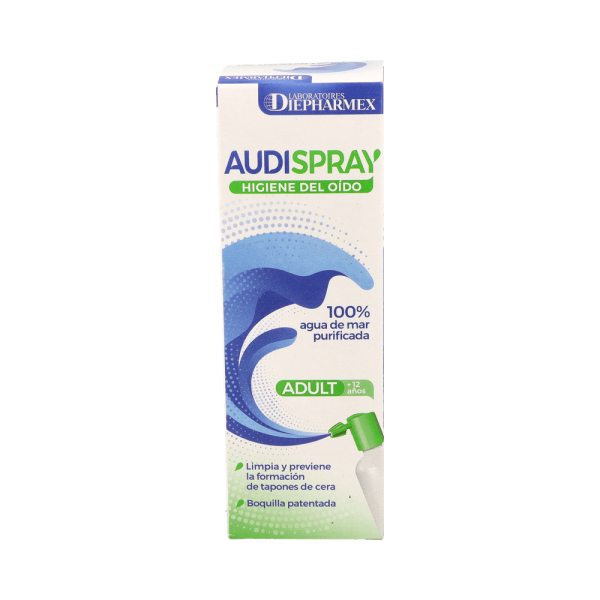 Audispray Adult higiene del oído es un producto natural elaborado a base de agua de mar filtrada y microbiológicamente controlada de eficacia probada. El agua del mar es una solución marina ideal para la higiene, con total seguridad. Gracias a las propiedades de sus iones y oligoelementos, se favorece la disociación y disgregación de los elementos constitutivos del cerumen. Este producto tiene una tecnología de difusión que garantiza una vaporización suave y homogénea con el fin de tapizar sin exceso la totalidad del conducto auditivo. Contiene un pulsador adaptado a la anatomía del oído que impide cualquier riesgo por exceso de presión sobre el tímpano y una bomba dosificadora que libera una cantidad de solución de forma regular y adaptada.