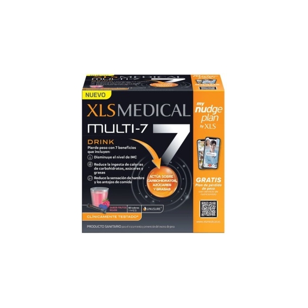 XLS Medical Multi-7 Drink: Disminuye el IMC; Atrapa carbohidratos, azúcares y grasas; Reduce la sensación de hambre; Reduce centímetros de cintura y caderas; Aumenta la sensación de saciedad.